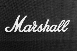 The photograph captures the iconic 'Marshall' logo, elegantly displayed in white against a rich black backdrop. The juxtaposition of the smooth lettering and textured surface creates a striking visual contrast, evoking a sense of nostalgia and rock history. Soft lighting enhances the logo's prominence, inviting the viewer into a world of music and passion.