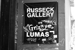 This black and white photograph captures the gritty texture of a street sign for the Russeck Gallery, partially obscured by graffiti. The contrast of bold lettering against chaotic scribbles creates a striking visual tension, reflecting an urban landscape where art meets anarchy. The diffused lighting adds a somber mood, inviting viewers to contemplate the interplay between artistic expression and vandalism.