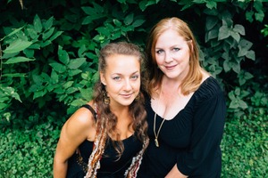 In this intimate portrait, two women sit closely together, radiating warmth and connection amidst a lush backdrop of green foliage. The soft, diffused lighting enhances their expressions, creating a serene and inviting mood, while their contrasting styles—one with flowing hair and bohemian accessories, the other with classic elegance—highlight their unique personalities. The composition draws the viewer's eye to their faces, emphasizing the bond they share in this tranquil, natural setting.