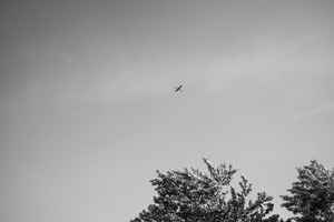 A solitary airplane glides through a vast, cloudless sky, evoking a sense of tranquility and isolation. Below, the silhouettes of lush trees frame the scene, their dark foliage contrasting with the expansive gray backdrop. The soft, diffused light enhances the minimalist composition, adding depth while maintaining an air of peaceful simplicity.