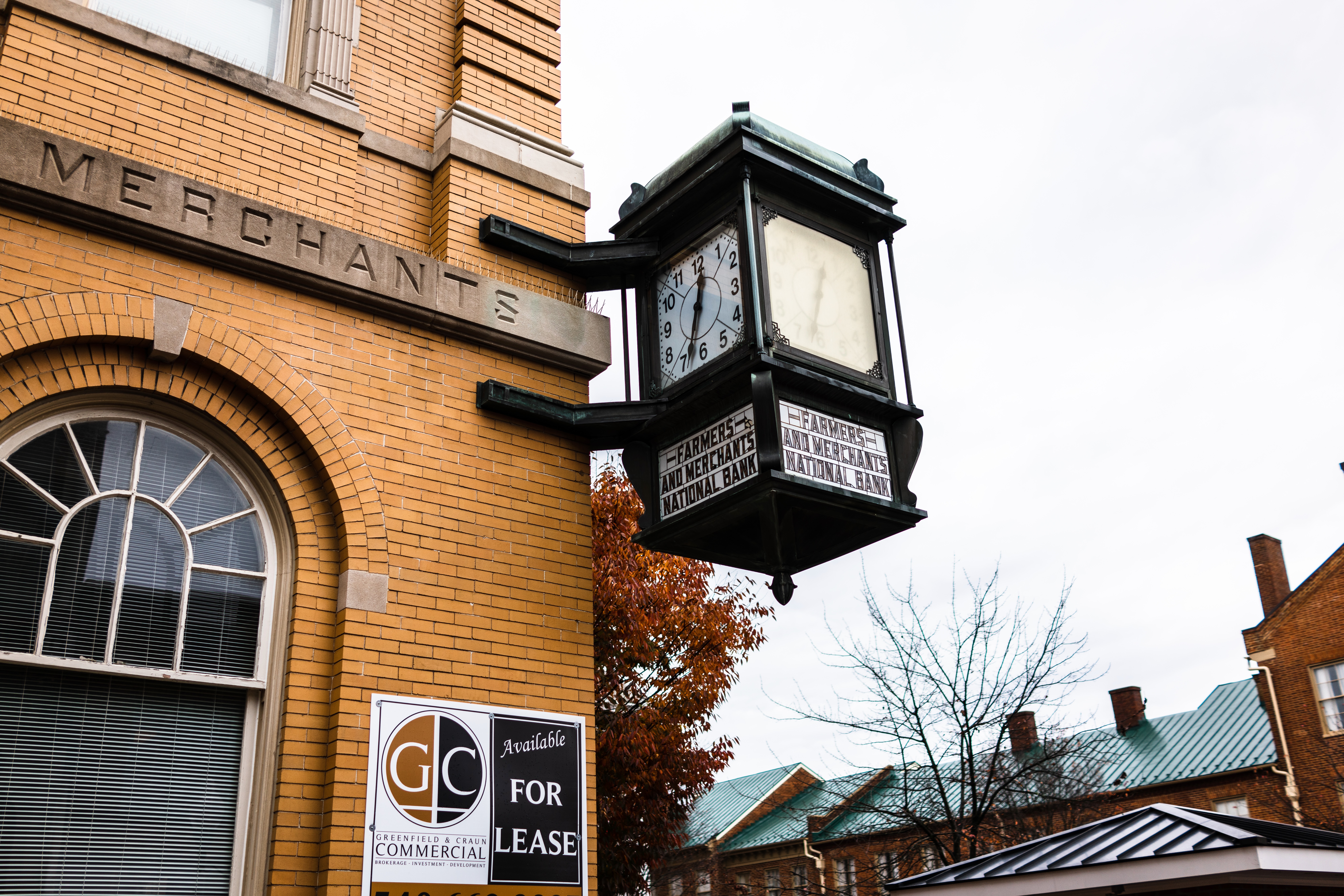 This photograph captures a vintage clock attached to a brick building, exuding a sense of nostalgia against a muted autumn backdrop. The warm tones of the brick contrast with the cool light filtering through a slightly overcast sky, evoking a calm yet reflective mood. Below, a 'FOR LEASE' sign hints at change, intertwining history with the present moment.