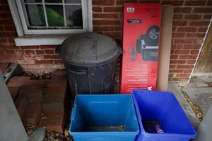 This photograph captures an outdoor corner filled with discarded items, where a dark trash can looms next to blue and purple bins, each holding remnants of past use. The muted brick wall and shadowy lighting evoke a sense of stillness and neglect, contrasting sharply with the vibrant colors of the bins. The composition speaks to the hidden stories of everyday life, lingering in the edges of a bustling environment.