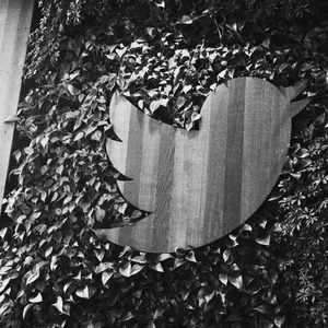 This photograph features the iconic Twitter bird symbol, seamlessly integrated into a lush backdrop of greenery. The contrast of the wooden texture against the vibrant leaves creates a striking visual harmony, evoking a sense of connectivity between nature and technology. Soft, diffused lighting enhances the overall mood, giving the scene a serene and inviting atmosphere.