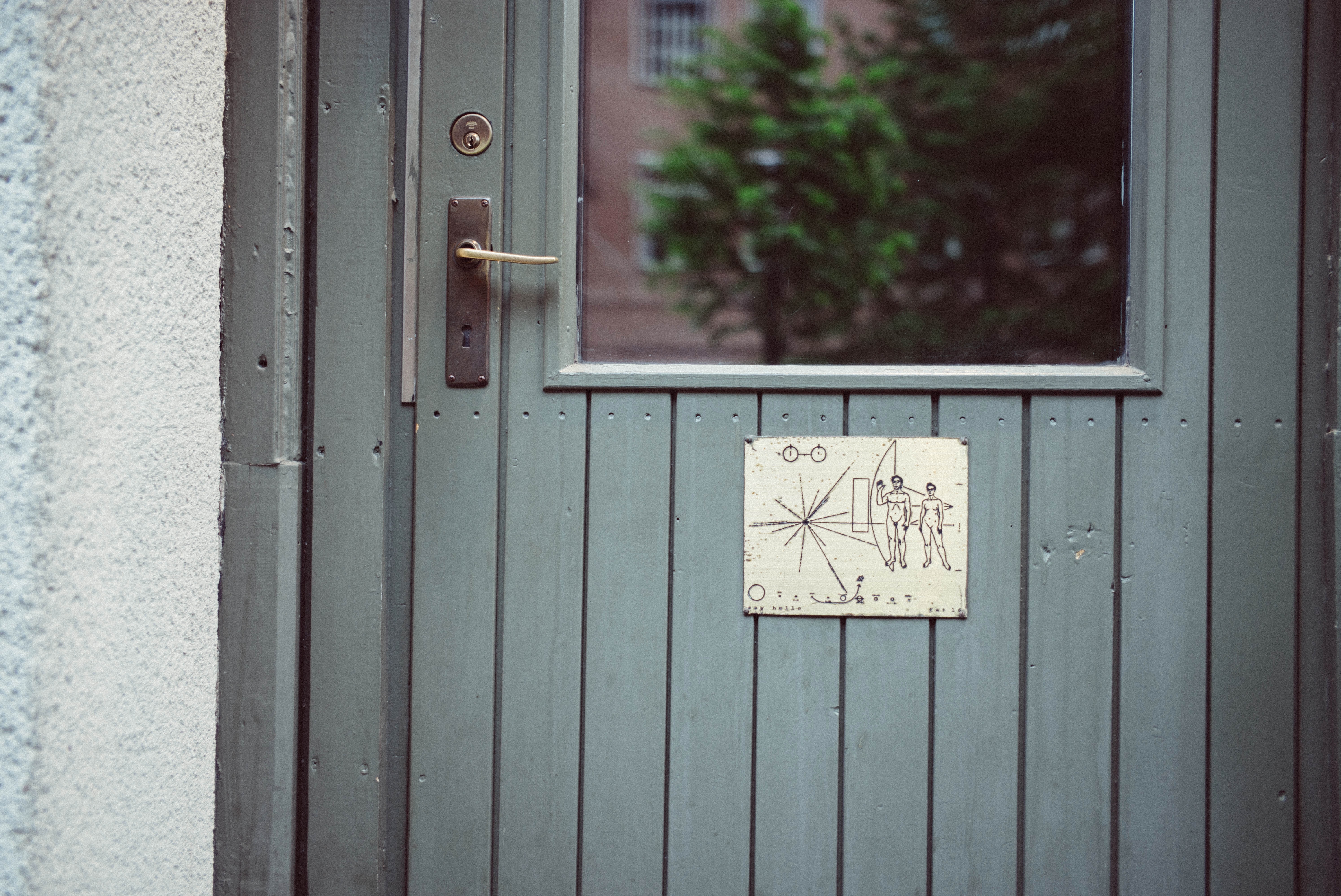 This photograph captures a weathered green door, adorned with a curious emblem that hints at a story waiting to be unlocked. Soft, natural light filters through the window, reflecting hints of greenery, creating a tranquil ambiance that contrasts with the mysterious artwork below. The composition invites the viewer to ponder the narratives hidden behind the door, evoking feelings of nostalgia and curiosity.