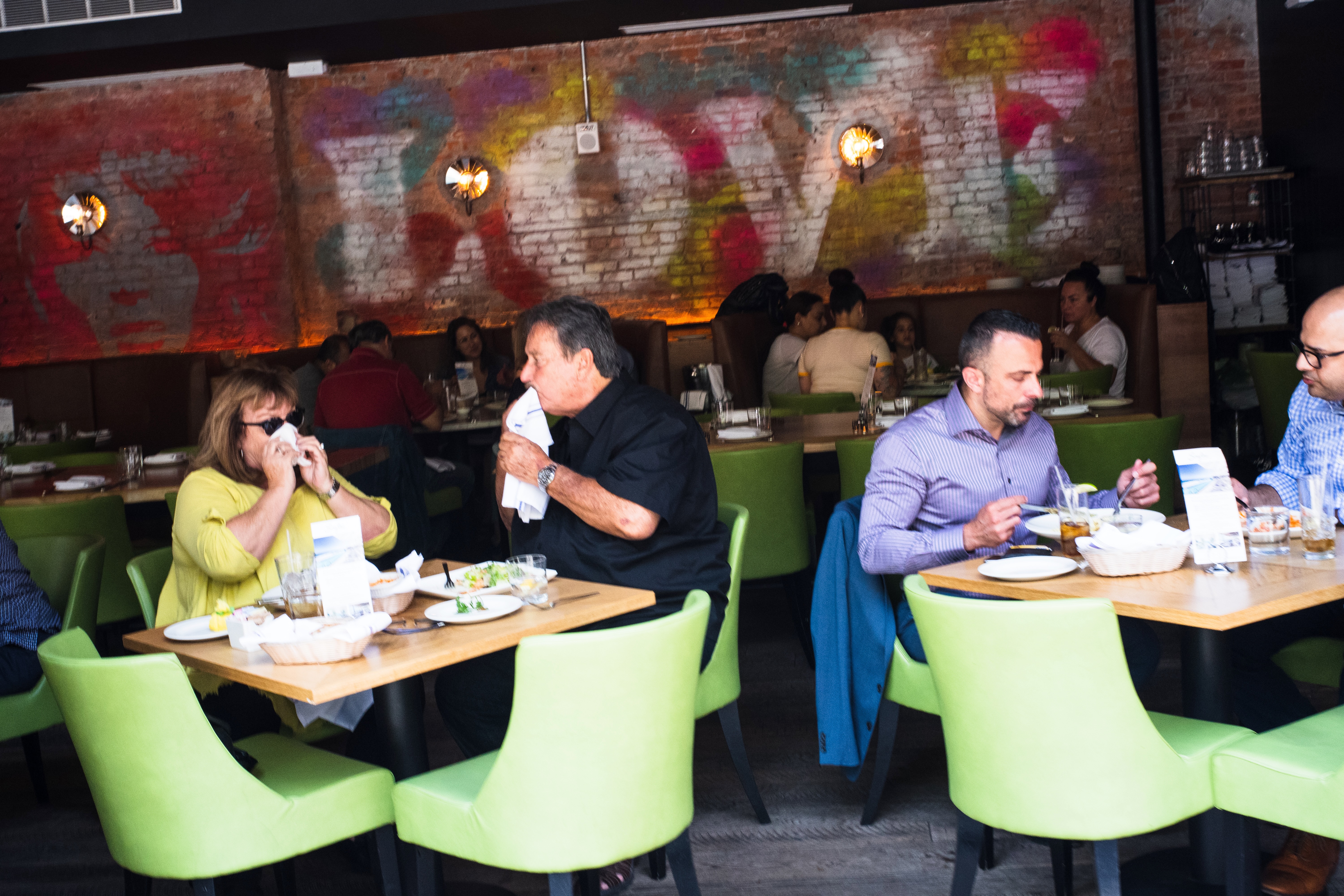 In a vibrant restaurant setting, diners engage in lively conversation, their expressions hinting at warmth and connection. The playful splash of colors on the brick wall spells 'love,' creating a cheerful backdrop to an intimate dining experience. Soft lighting enhances the mood, making each table feel inviting and alive.