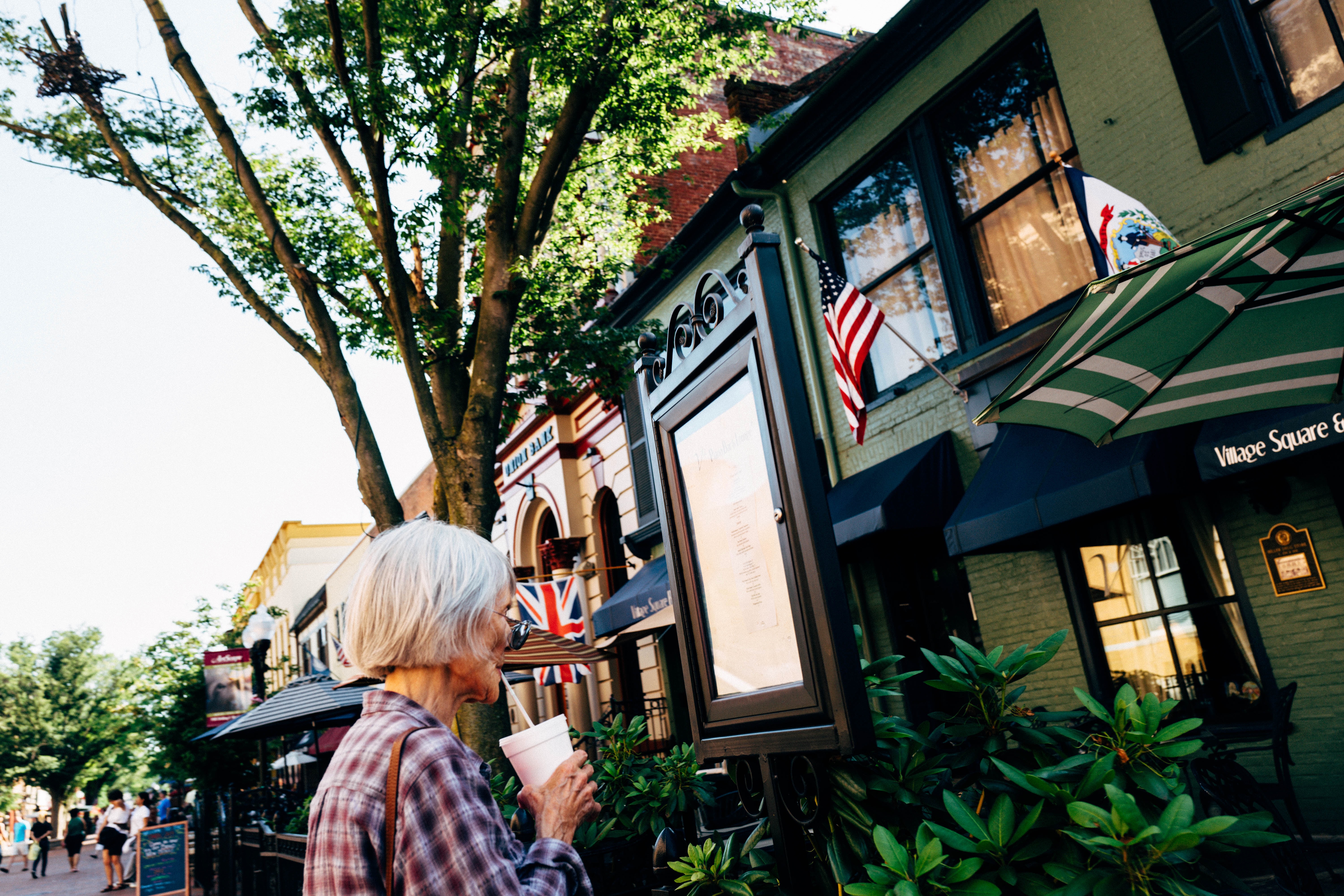An elderly woman stands thoughtfully outside a café, a warm drink in hand, as she gazes at the menu board. Sunlight filters through the trees, casting a gentle glow on the charming storefronts adorned with flags, creating a nostalgic atmosphere. The scene captures a moment of serene contemplation amidst the vibrant life of the street.