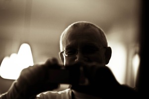 This photograph features an older gentleman, partially silhouetted, as he focuses intently on taking a picture. The warm sepia tones and soft lighting create a nostalgic atmosphere, highlighting the interplay between the subject and the act of capturing memories. The blurred edges convey a sense of intimacy and reflection, inviting viewers to ponder the stories behind the lens.