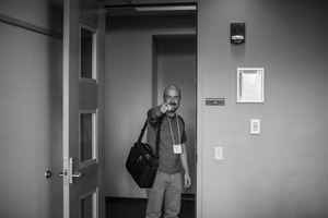 In this monochromatic photograph, a man stands in an open doorway, confidently pointing towards the viewer with a warm smile. The composition frames him against a simple, muted background, emphasizing his expression and gesture, while the soft lighting creates an inviting atmosphere. The scene captures a moment of connection, inviting the viewer into a space that feels both casual and engaging.