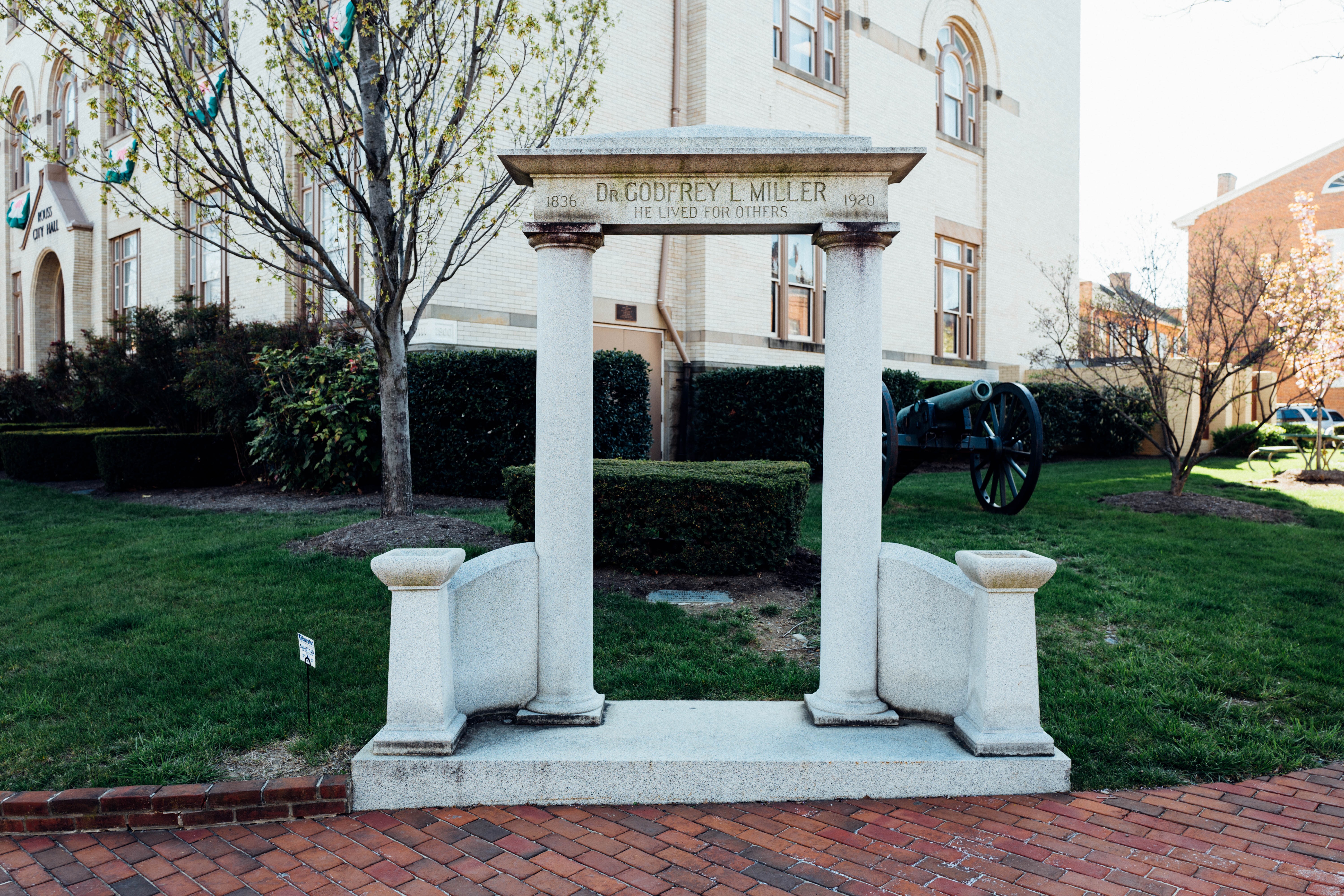 This photograph captures a stone monument dedicated to Dr. Godfrey L. Miller, framed by lush greenery and historic architecture. The warm lighting emphasizes the monument's clean lines and stoic presence, conveying a sense of reverence and reflection. Nearby, a cannon adds historical context, enhancing the solemn mood of this commemorative space.