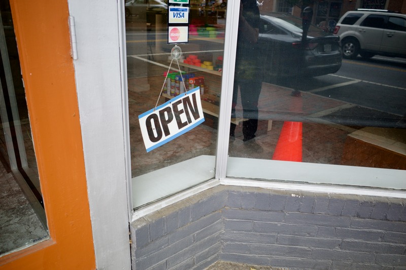 The photograph captures the inviting 'OPEN' sign prominently displayed in a shop's window, suggesting a sense of warmth and accessibility. The reflection of the street outside adds a layer of depth, contrasting the cozy interior with its vibrant colors. The soft, natural light enhances the inviting atmosphere, drawing the viewer’s eye toward the inviting space within.