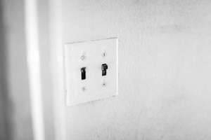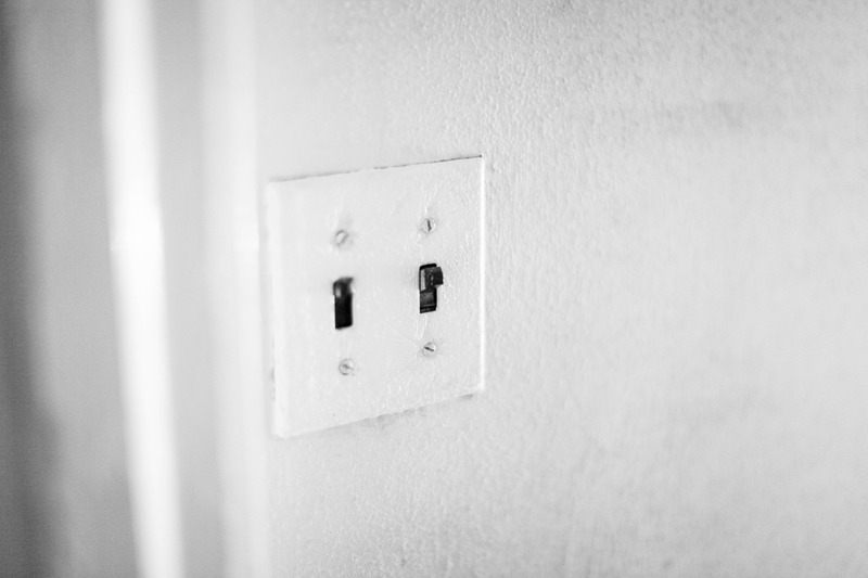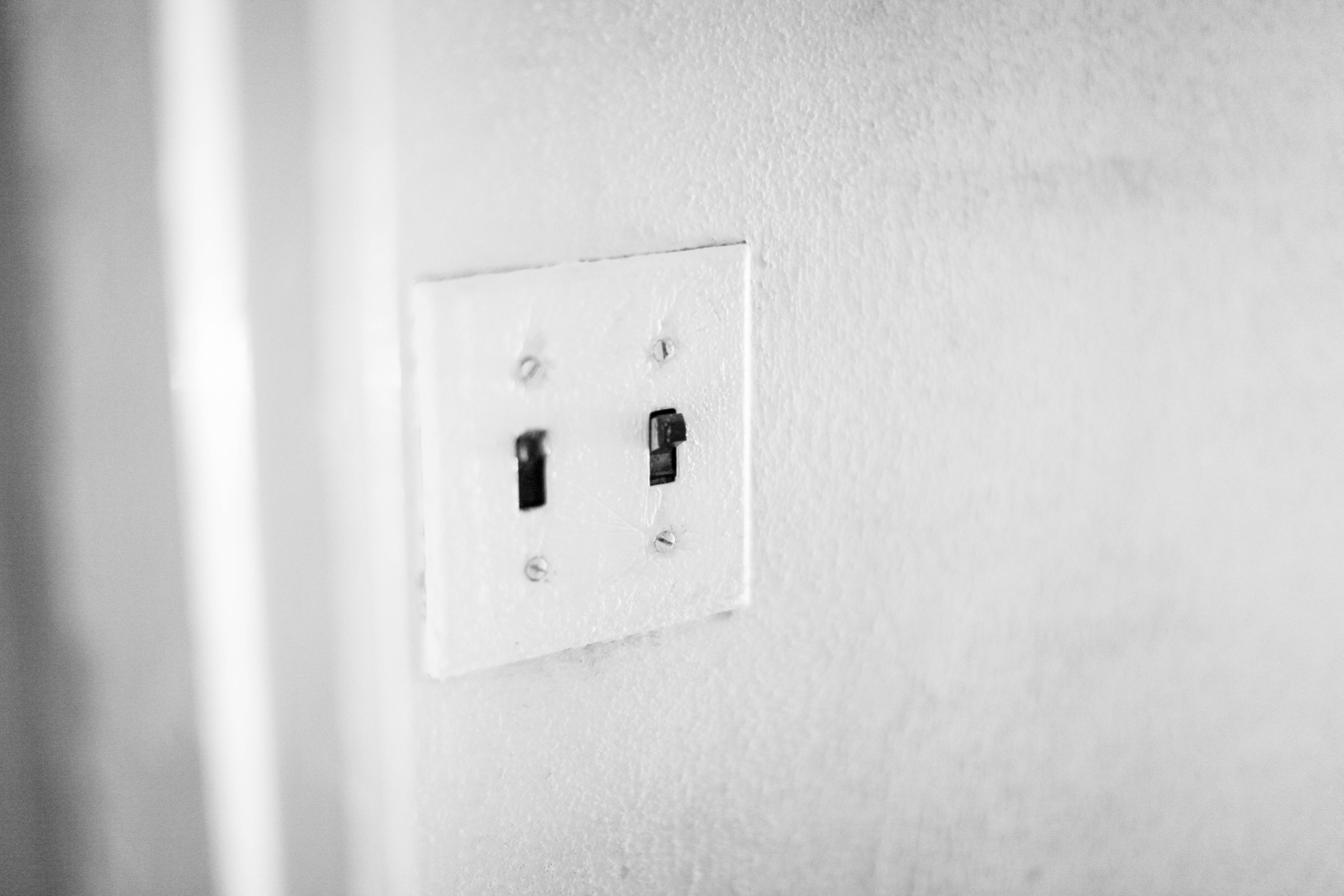 A close-up of a simple light switch plate on a textured wall, evoking a sense of nostalgia and stillness. The monochromatic tones enhance the minimalism and focus of the composition, casting a quiet mood. Soft, diffused lighting adds a subtle warmth, drawing attention to the everyday object that often goes unnoticed.