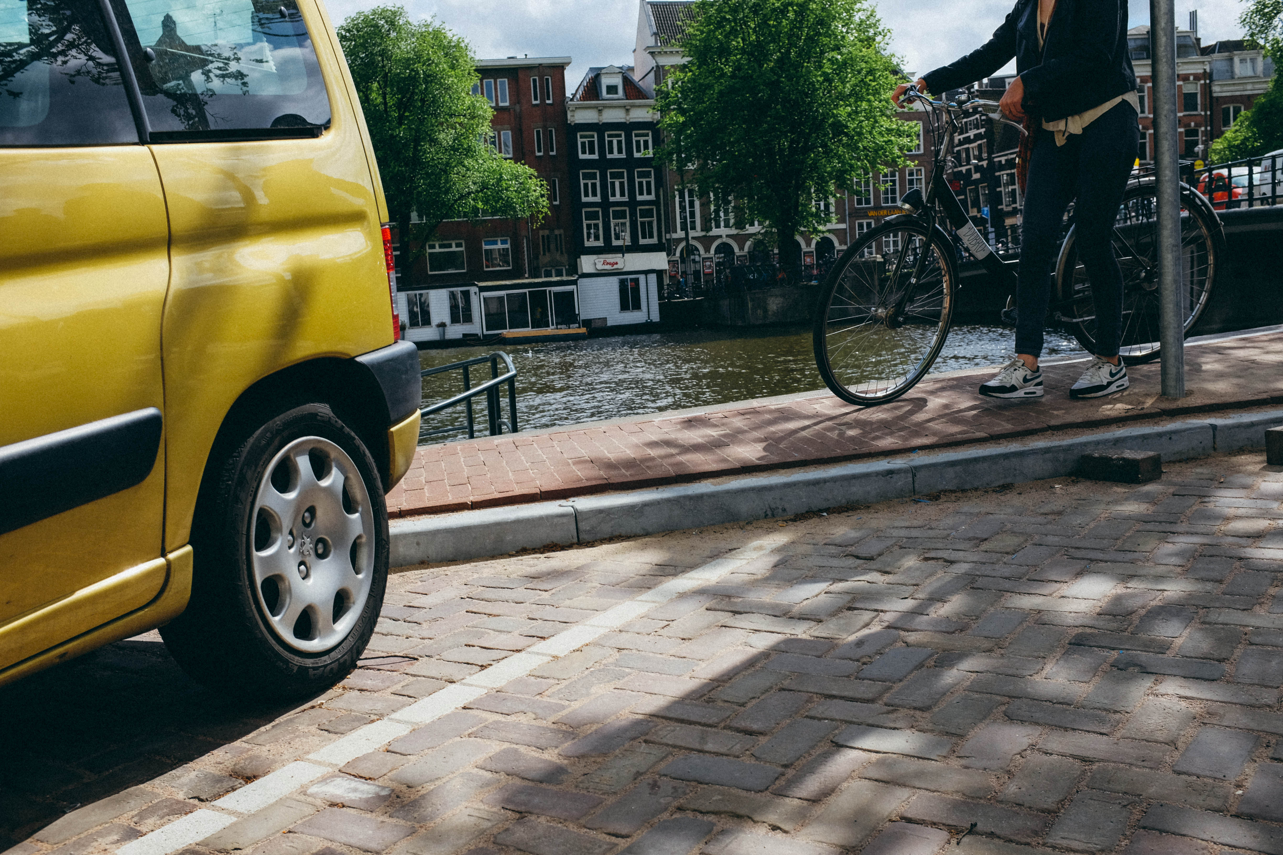 This photograph captures a tranquil moment along a picturesque canal, where a woman stands next to her bicycle, embodying a sense of urban exploration. The bright yellow car in the foreground contrasts with the lush greenery and historic buildings in the background, creating a vibrant yet calm composition. Soft natural light filters through the trees, casting gentle shadows that enhance the peaceful mood of the scene.
