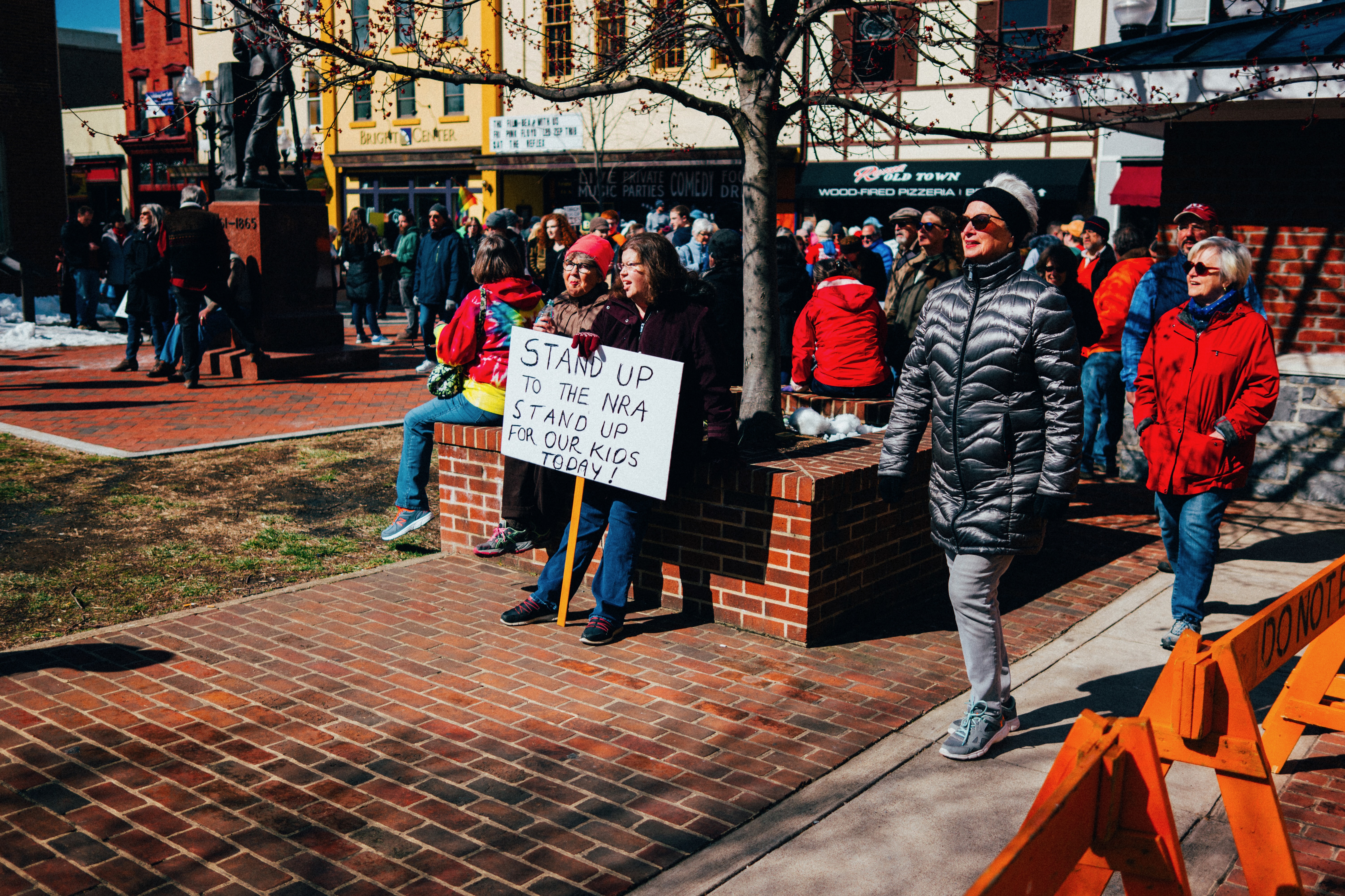 The photograph captures a moment at a protest where a group of individuals stands in solidarity, holding a sign demanding action against the NRA. The scene is vibrant, illuminated by bright sunlight, conveying a sense of urgency and hope amidst a backdrop of engaged citizens. The composition highlights both the message of activism and the diverse participants, creating a powerful visual narrative of community action.