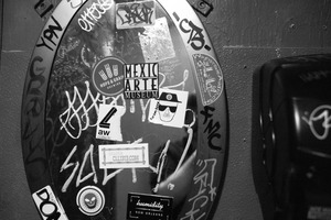 This photograph captures a black-and-white image of a round, graffiti-covered mirror, adorned with an array of colorful stickers. The chaotic assortment of designs juxtaposes the reflective surface, suggesting a gritty urban environment filled with art and stories. The lighting casts subtle shadows, enhancing the mood of intrigue and exploration.