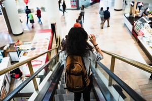 A young woman descends an escalator, her brown backpack contrasting with the bustling mall environment. She holds a water bottle, suggesting a moment of refreshment amidst the lively atmosphere. The warm lighting and varied movement of shoppers create an inviting and dynamic urban scene.