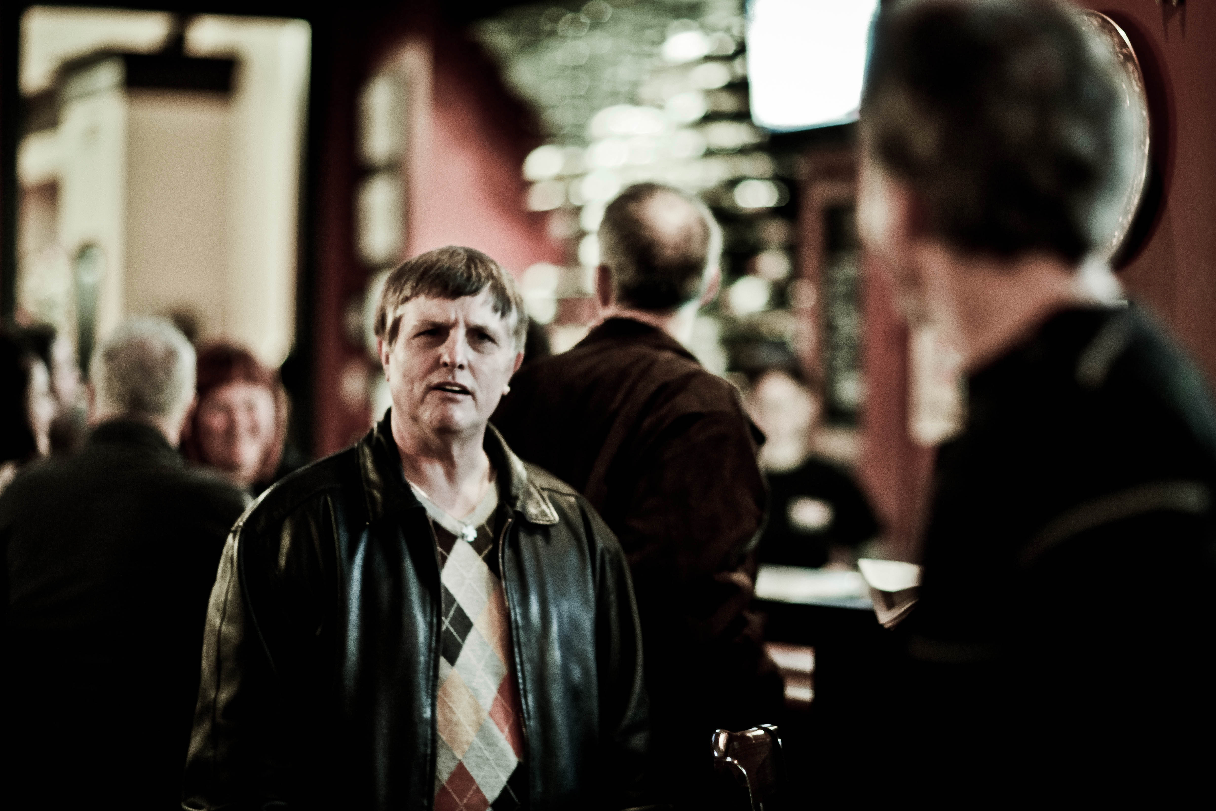 In a bustling bar filled with indistinct chatter, a man stands out with a puzzled expression, exuding a sense of curiosity or uncertainty. The warm, dim lighting creates an intimate atmosphere, accentuating the rich textures of his leather jacket and the surrounding blurry figures. The composition effectively contrasts his stillness against the lively background, inviting viewers to delve into his story amidst the social scene.