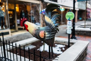 This photograph captures a vibrant metal sculpture of a rooster, prominently displayed among a quaint town square setting. The playful colors of the rooster contrast with the subdued tones of the storefronts in the background, creating a lively focal point. Soft lighting enhances the texture of the metal, adding a reflective charm to the scene, which feels both inviting and nostalgic.