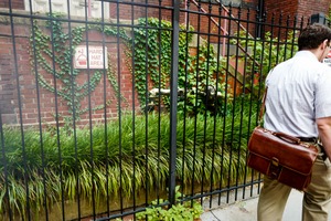 The photograph captures a solitary figure walking past an iron fence adorned with lush greenery and a warning sign. The soft, diffused light creates a calm yet slightly tense atmosphere, hinting at the juxtaposition of nature and urban life. The composition draws the eye to the vibrant grass contrasting with the hard lines of the fence and brick wall behind it.