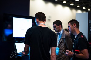 In a bustling tech environment, three attendees focus intently on a digital presentation. The ambient lighting casts a soft glow, creating a sense of concentration and collaboration as they explore new ideas together.