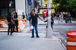 In a bustling urban setting, a young man smiles as he holds hands with a companion, capturing a moment of connection amidst the city hustle. The warm golden hour light casts a soft glow, enhancing the lively atmosphere of the street filled with pedestrians and construction barriers. Vibrant colors and varied expressions convey a sense of joy and camaraderie in the dynamic urban landscape.