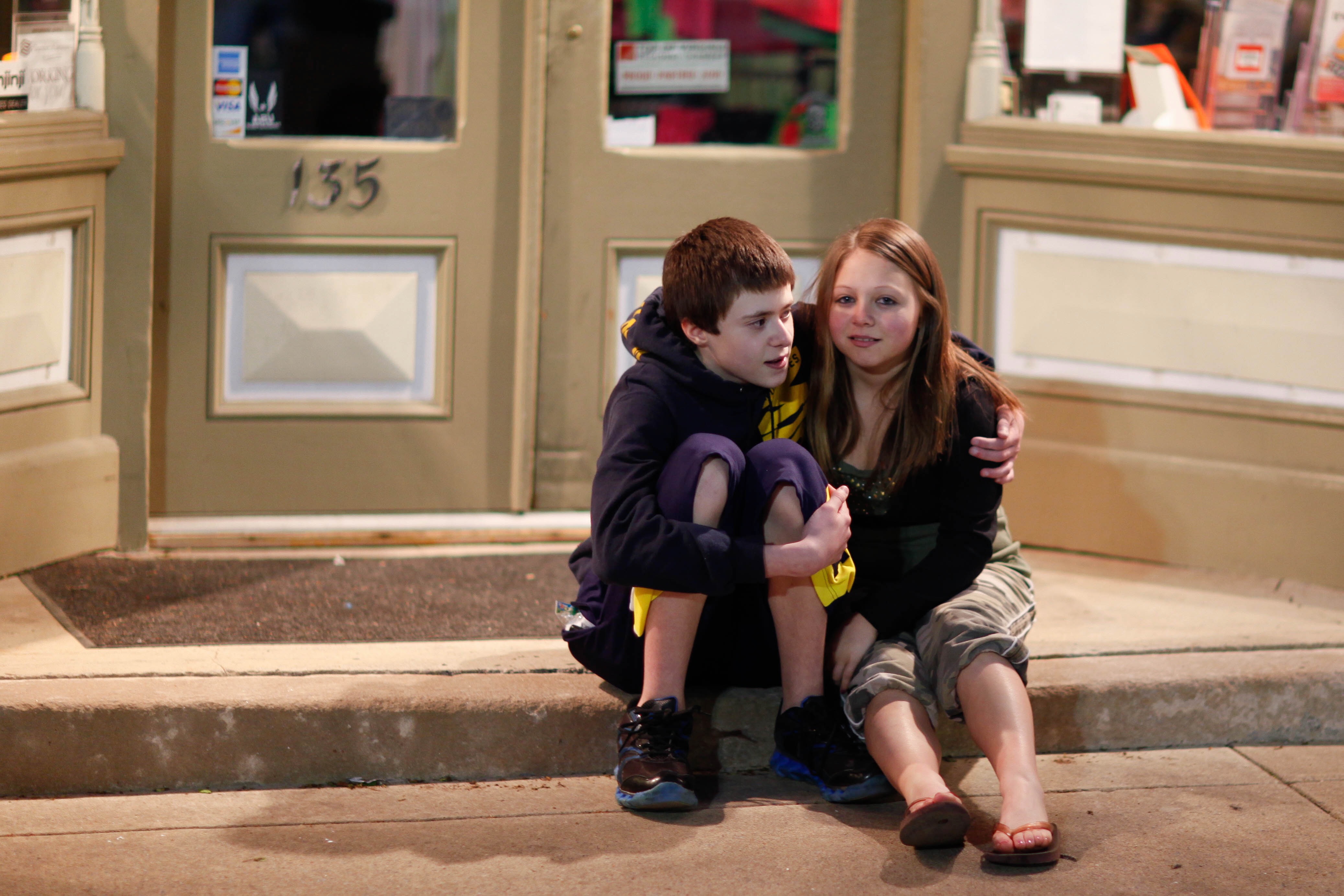 In the soft glow of streetlights, two young friends share a moment on the steps of a storefront, exuding a sense of warmth and camaraderie. The boy leans in, playfully engaging with the girl who responds with a coy smile, reflecting the innocence of youth. The lighting adds a gentle ambiance, creating a nostalgic atmosphere that captures a fleeting moment of friendship.