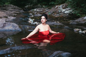 A striking figure in a flowing red dress sits gracefully in a tranquil stream, surrounded by smooth stones and lush greenery. The soft, diffused lighting bathes the scene in a gentle glow, creating an ethereal mood that highlights the subject's contemplative expression. The contrast between the vibrant red fabric and the serene natural backdrop evokes a sense of harmony and allure.
