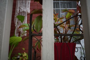 Framed through a wrought iron fence, vibrant green and reddish leaves emerge from a red pot, creating a vivid contrast against the muted brick wall. The soft, diffused lighting lends a serene, contemplative mood to the scene, while delicate hanging beads softly blur the background. This composition evokes a sense of intimacy and quiet refuge within an urban environment.