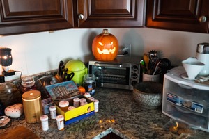 The photograph captures a cozy kitchen corner adorned with a glowing jack-o'-lantern, its mischievous expression illuminating the space with a warm, inviting light. Surrounding it, various kitchen items create a cluttered yet homely atmosphere, reinforced by soft shadows and the rich wood of the cabinetry. The mood is playful and festive, encapsulating the spirit of autumn and the joy of seasonal celebrations.