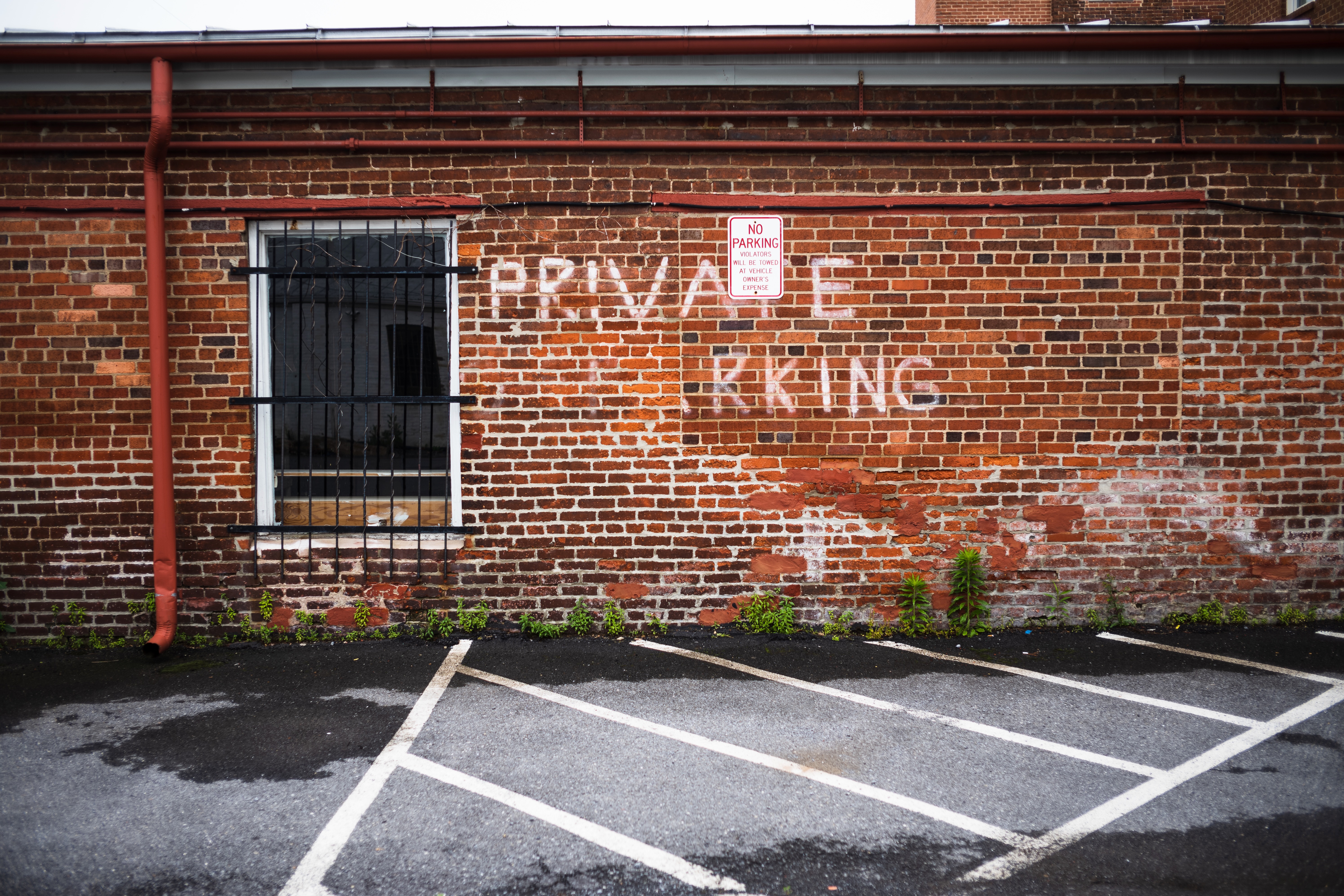 A weathered brick wall dominates the frame, its rough texture illustrating the passage of time. Faded graffiti reading 'PRIVATE PARKING' contrasts starkly with the vibrant red bricks, evoking a sense of neglect and isolation. The muted lighting and empty parking spaces amplify the mood of abandonment and unwelcoming inefficiency.