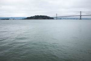 A serene view of the bay stretches before us, with a distant island framed by a muted sky. The softly rippling water reflects the somber gray tones, creating a contemplative mood. The Bay Bridge looms gracefully in the background, serving as a link between nature and urban life, while the overall composition evokes a sense of calm and solitude.