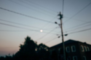 This photograph captures a dreamy twilight scene, with soft hues blending into the evening sky. The blurred outlines of a telephone pole and building create a sense of detachment, while the faint glow of the moon adds a serene atmosphere. The tangled lines of power cables intersect against the soft backdrop, hinting at the complexity of urban life transitioning into night.