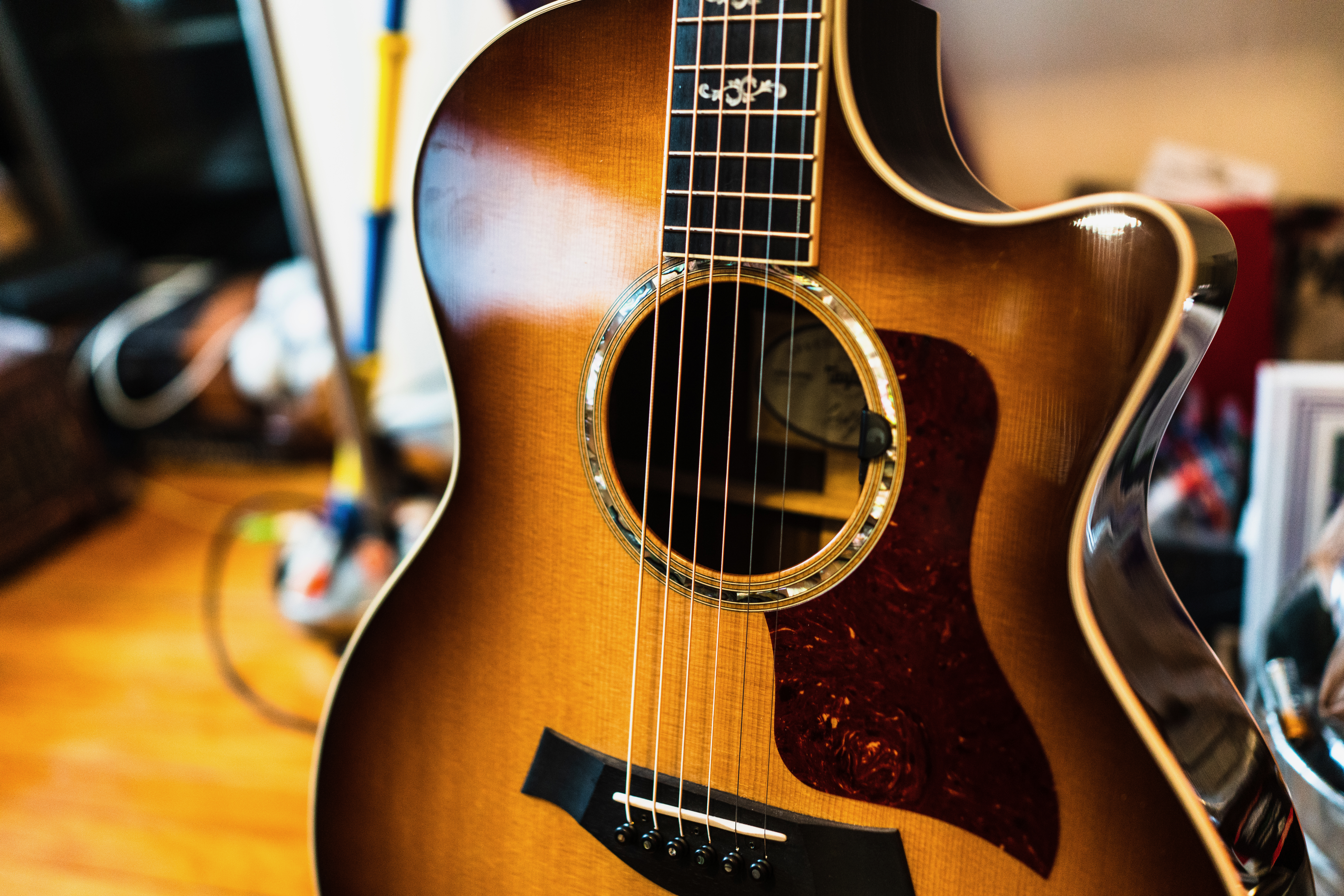 This close-up shot of an acoustic guitar captures the polished wood grain and gleaming strings, evoking a sense of warmth and tranquility. The soft lighting accentuates the rich tones of the instrument, creating an inviting mood that invites the viewer to imagine the melodies it produces. The blurred background hints at a cozy space, enhancing the intimate atmosphere of musical creativity.