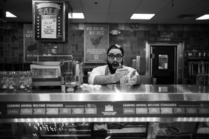In this candid black-and-white photograph, a man in a chef's attire expresses surprise and excitement from behind a deli counter. The stark contrast of the lighting highlights his animated gestures, creating a lively atmosphere within the bustling interior of a food market. The vibrant signage and products behind him add context, contrasting with his exuberant expression, which invites the viewer into a moment of unexpected joy.