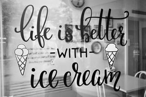 A playful window decal captures the essence of delight with its cheerful proclamation, 'life is better with ice cream.' The stark black-and-white contrast enhances the whimsical typography, inviting a sense of nostalgia. Soft natural light filters through, creating a warm ambiance that complements the message of happiness and indulgence.