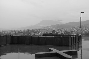 In a moody black-and-white scene, a stark cross sculpture rests on a rain-slicked surface, framed by a concrete barrier. The distant mountains stand shrouded in mist, merging with the overcast sky, while the urban landscape unfolds in soft focus below. The composition conveys a sense of solitude and contemplation, enhanced by the muted lighting and reflective surfaces.