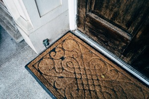 The photograph captures a close-up view of a textured doormat positioned at the entrance of a wooden door. Soft, natural light illuminates the scene, creating a warm and inviting atmosphere, while the intricate patterns of the mat contrast with the rustic wood of the door. A slight sense of anticipation lingers in the air, suggesting the moments just before a visitor steps inside.