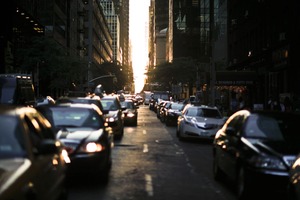 This photograph captures a bustling city street during golden hour, where the sunlight creates a striking vertical beam at the far end, illuminating the scene amid towering skyscrapers. The composition is filled with a dense line of cars, highlighting the frenetic pace of urban life, contrasted by the warm, tranquil glow of the setting sun. The overall mood is a blend of energy and calmness, inviting the viewer to reflect on both the chaos of the city and the beauty of fleeting moments.