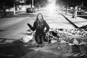 In a striking black-and-white composition, a young woman sits confidently in a chair amidst a chaotic backdrop of garbage on a dimly lit street. The contrast between her composed demeanor and the stark environment evokes a sense of resilience, while the distant headlights illuminate the scene with an eerie glow. Shadows play across the pavement, enhancing the mood of solitude and defiance in a neglected urban setting.