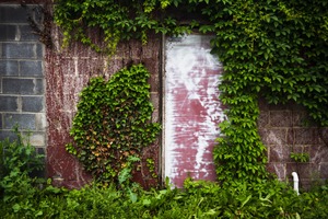 This photograph captures a weathered door partially obscured by lush greenery, creating a striking juxtaposition of nature reclaiming a forgotten space. The muted reds and greens evoke a sense of nostalgia and mystery, enhanced by soft, diffused lighting that contributes to the tranquil yet eerie atmosphere. The composition draws the eye to the door, inviting speculation about what lies beyond while celebrating the beauty of decay and renewal.