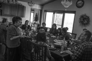 The photograph captures a lively gathering around a dining table, filled with diverse dishes that hint at a festive occasion. The black and white tones enhance the warmth of shared laughter and conversation, creating an intimate atmosphere among family members. Soft, natural light filters through the windows, illuminating the scene and highlighting the connections between generations.