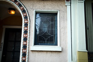The photograph captures a quaint architectural segment, showcasing a window framed with intricate designs that suggest history and charm. Soft, diffused light highlights the textured stucco walls, creating a gentle mood that evokes a sense of nostalgia. The composition, with the contrasting dark door and the warm tones, draws the viewer's eye towards the window, inviting contemplation about the stories held within these walls.