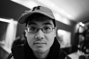 In this candid black and white portrait, a young man with glasses and a cap stares directly at the camera, his expression thoughtful and serene. The soft lighting accentuates his features against a blurred background, creating a sense of intimacy and focus on his contemplative mood. The composition draws the viewer in, inviting them to connect with the subject's quiet presence amid the bustling environment.