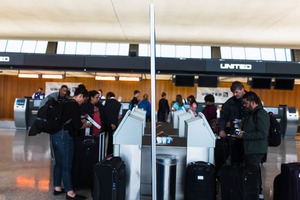 The photograph captures a bustling airport check-in area, filled with travelers engrossed in their journey, creating a sense of anticipation and excitement. The composition highlights a division between two groups of passengers, with warm wood tones contrasting against sleek, modern kiosks, while soft, diffused natural light streams through the large windows, enhancing the vibrant atmosphere. The mood is lively yet slightly chaotic, perfectly encapsulating the essence of transit and the myriad stories unfolding in the space.