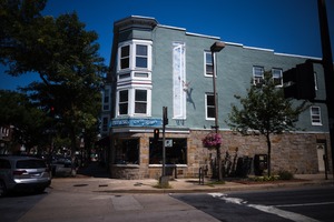 A quaint corner building, painted in soft blue, exudes charm with its vintage windows and decorative elements. The bright sunlight casts strong contrasts, highlighting details like the hanging flowers and the eye-catching mural. The mood is tranquil yet vibrant, embodying the peaceful essence of an afternoon in a lively neighborhood.