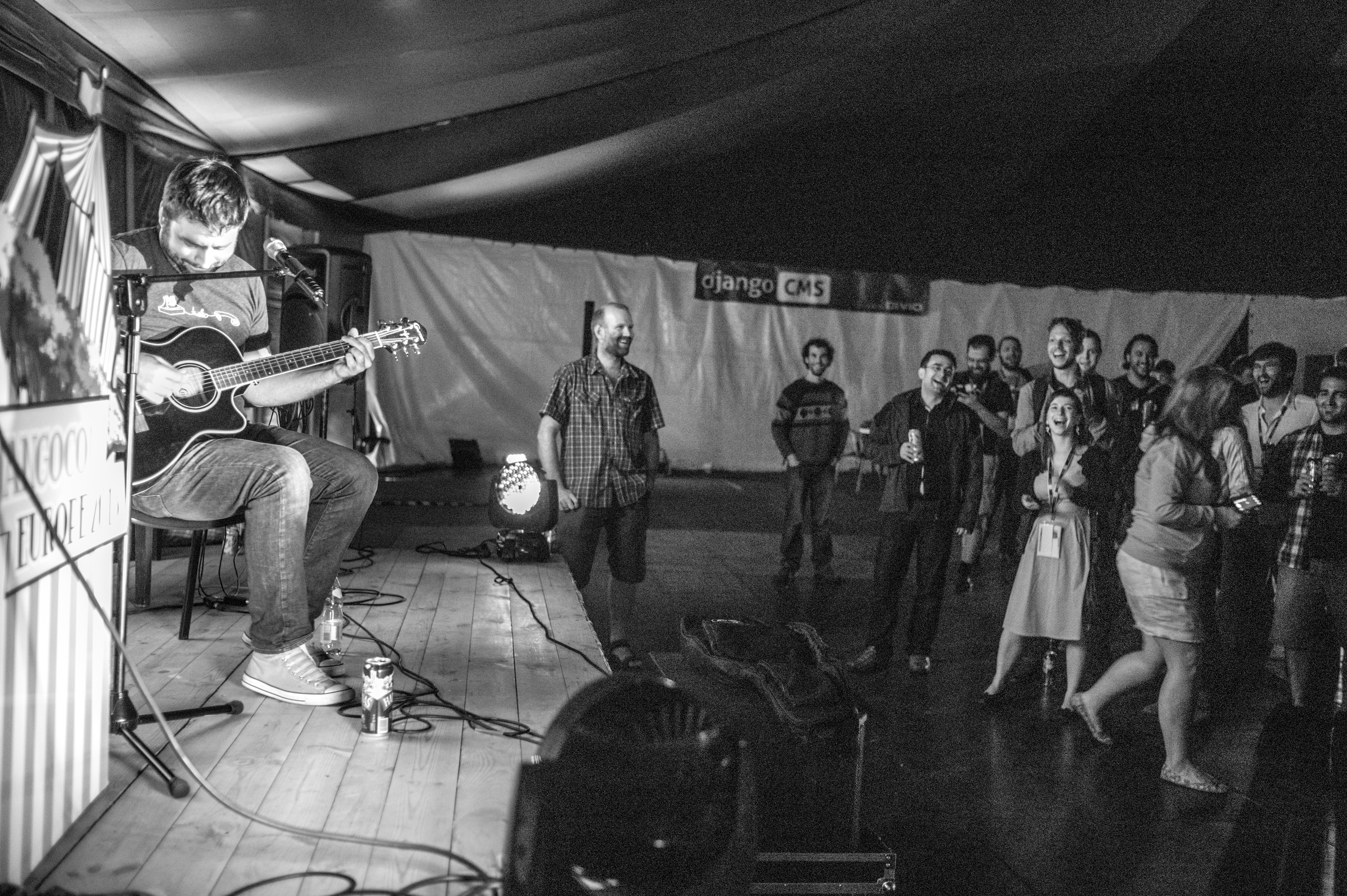In a cozy, tented setting, a musician strums an acoustic guitar, lost in his music while seated on a simple stool. The audience, a mix of engaged listeners and casual supporters, radiates an atmosphere of warmth and connection, highlighted by soft lighting that casts gentle shadows. The monochrome palette adds a nostalgic touch, evoking a sense of timelessness in this intimate concert moment.