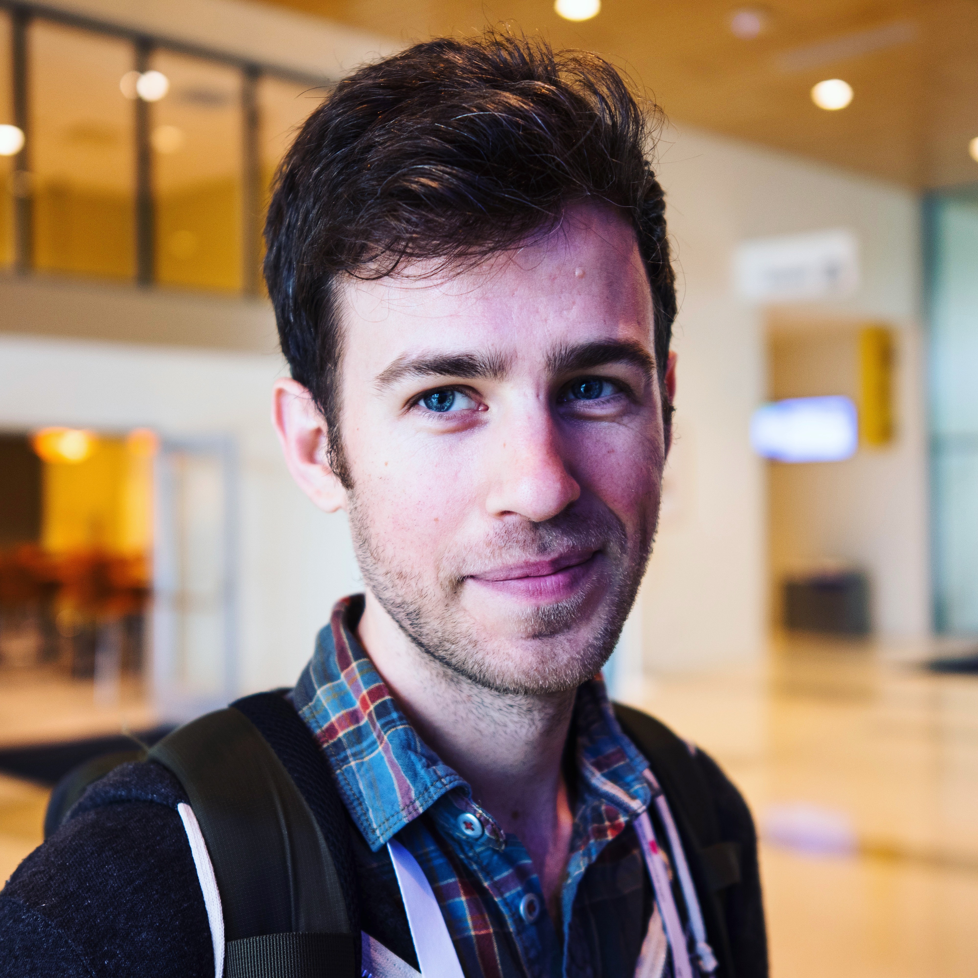 The photograph captures a young man with striking blue eyes, set against a backdrop of soft, contemporary architecture. His warm smile and relaxed demeanor convey an inviting mood, enhanced by the gentle, diffused lighting that highlights his features. A sense of openness emanates from the composition, drawing the viewer into a moment of connection in a bustling environment.