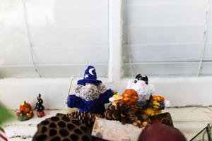 In this charming scene, two handmade figures—a wizard and a fluffy creature—stand amidst a backdrop of natural elements like pinecones and decorative pumpkins. The soft, diffused light streaming through the blinds creates an inviting and cozy atmosphere, enhancing the playful mood of this delightful arrangement. The intricate textures and colors of the figures contrast beautifully with the muted tones of the background, drawing the eye to their enchanting presence.