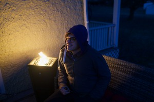 A young man sits thoughtfully beside a flickering flame, its warm glow contrasting sharply with the cool twilight surrounding him. The gentle light illuminates his face, revealing a contemplative mood as he gazes into the distance. The composition balances the intimacy of the moment with the quiet, expansive darkness of the evening.