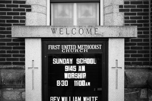 The photograph captures the entrance of the First United Methodist Church, featuring a sign that welcomes visitors to Sunday services. The black-and-white tones add a nostalgic mood, while the stone architecture conveys a sense of timelessness and tradition. Light filtering through the windows creates a soft glow, enhancing the inviting atmosphere of the space.