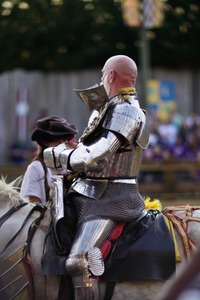In this photograph, a knight clad in gleaming silver armor sits elegantly atop a horse, exuding both majesty and quiet contemplation. The soft, natural light highlights the intricate details of his armor, contrasting with the blurred figures of a lively crowd in the background, creating a sense of both focus and festivity. The overall mood captures a slice of history, merging the anticipation of a jousting event with the serene poise of the knight before the spectacle begins.